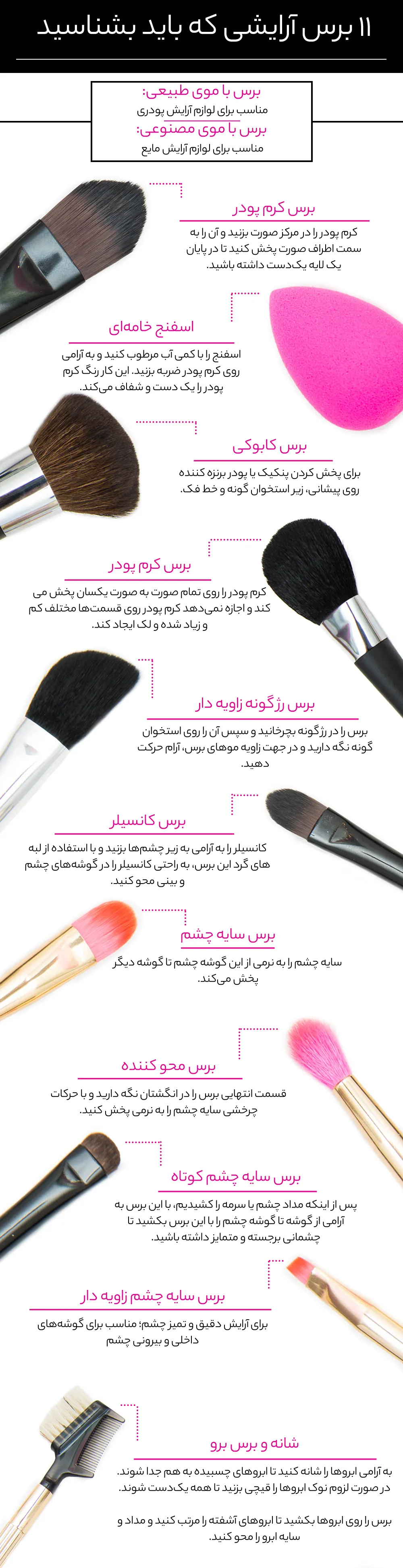 در این اینفوگرافیک سعی کردیم تمام اطلاعاتی که شما قبل از خرید و استفاده از انواع برس آرایش باید بدانید را در اختیارتان قرار دهیم.